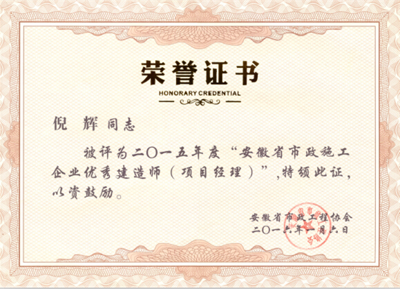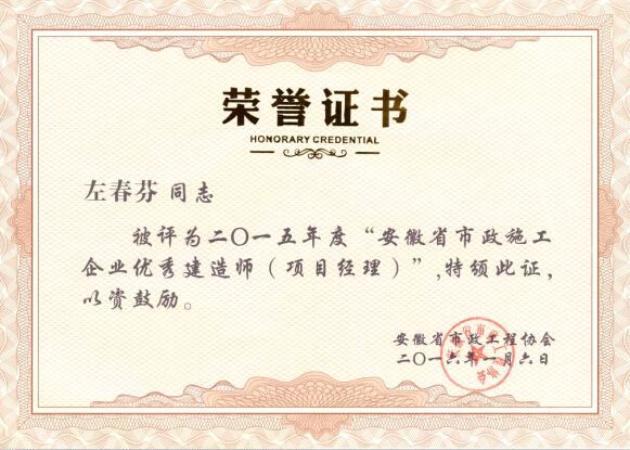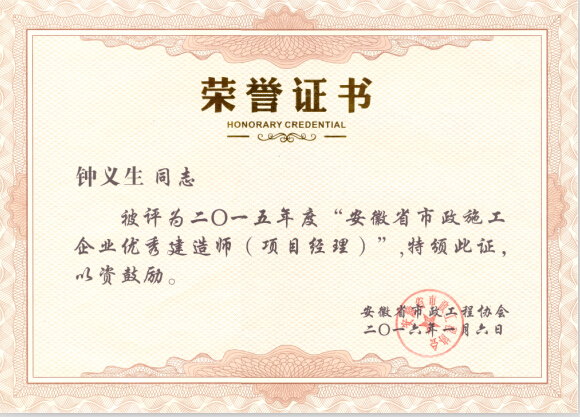 在安徽省市政工程協(xié)會組織評選的2015年度“安徽省市政施工企業(yè)優(yōu)秀項目經(jīng)理”活動中,我公司鐘義生、倪輝、左春芬三位同志獲得此項殊榮,此次全省共評選出66位市政優(yōu)秀項目經(jīng)理,我公司斬獲三枚獎狀,再次祝賀以上三位同志。