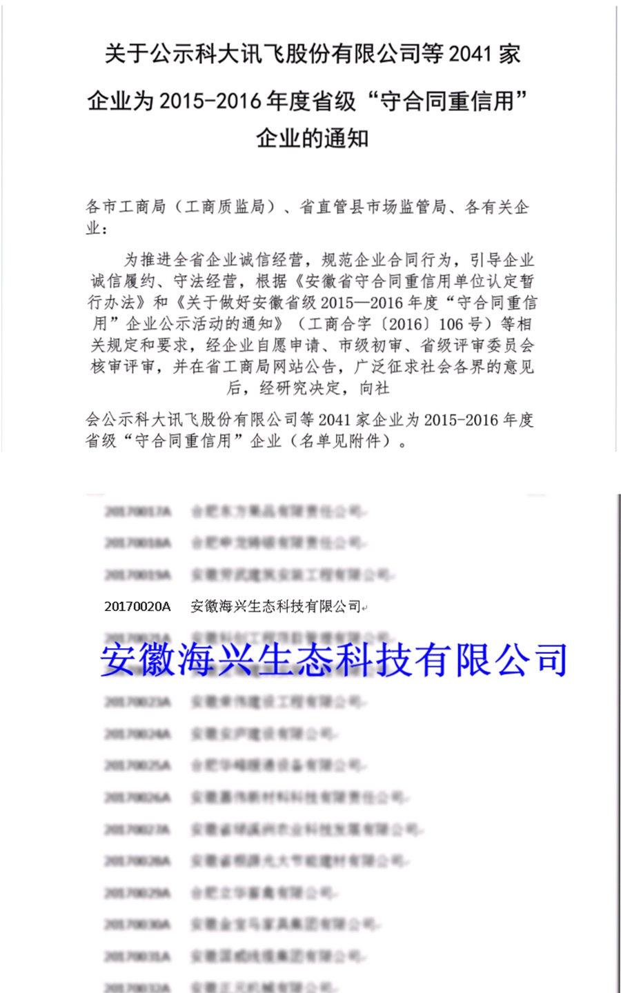 近日,安徽省工商行政管理局公布了2015-2016年度省級“守合同重信用”企業名單,我公司憑借誠信的經營方式和良好的合作信譽再次獲得此項殊榮。